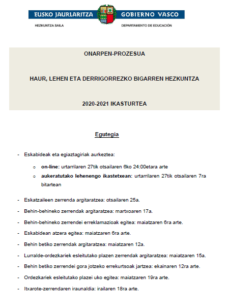 Oharra: estekan dagoen dokumentazioa deskargatu eta inprimatuz gero, ez da maiatzaren 20 eta 21ean eskolan banatuko diren inprimakien bila joan behar.