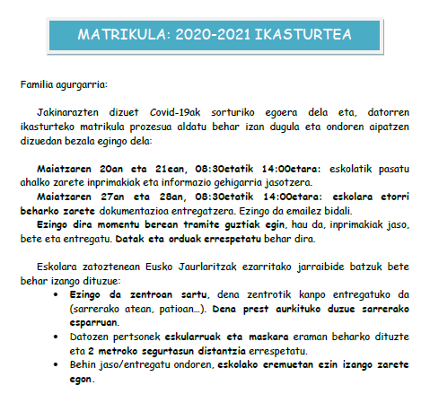 Dokumentazio guztia hemen aurkituko duzue (esteka erabilgarri egongo da matrikula garaia bukatu arte): 2020/2021 Matrikulazio Dokumentazioa