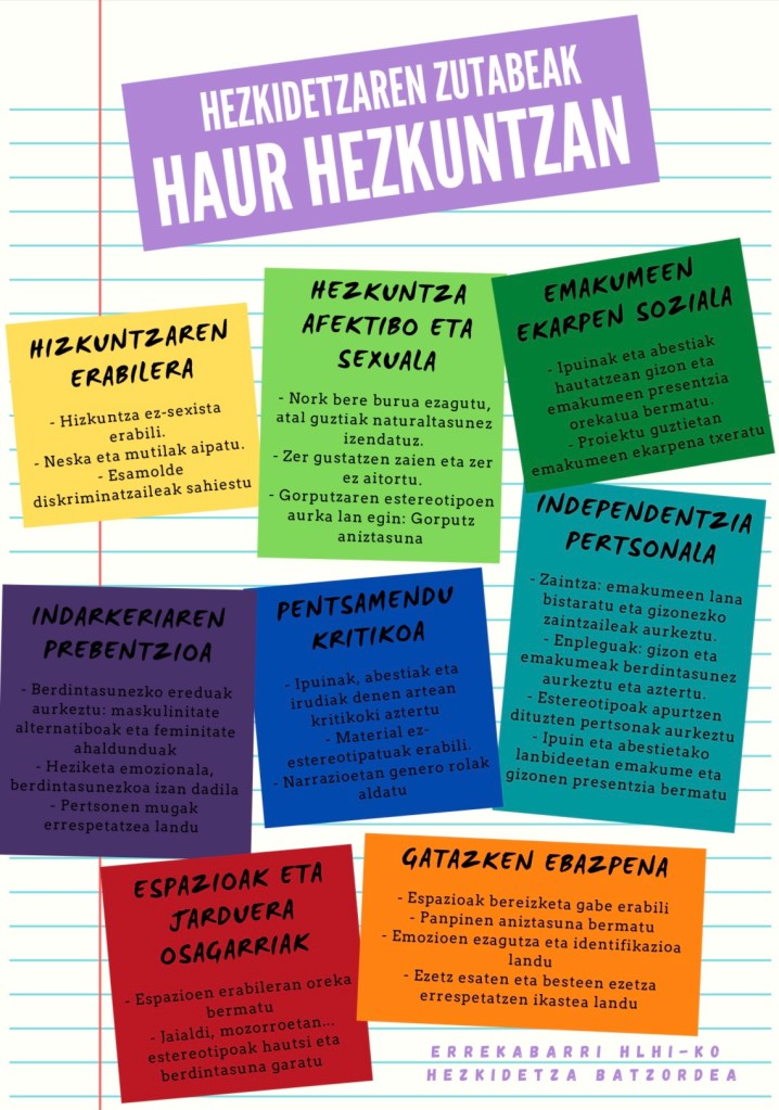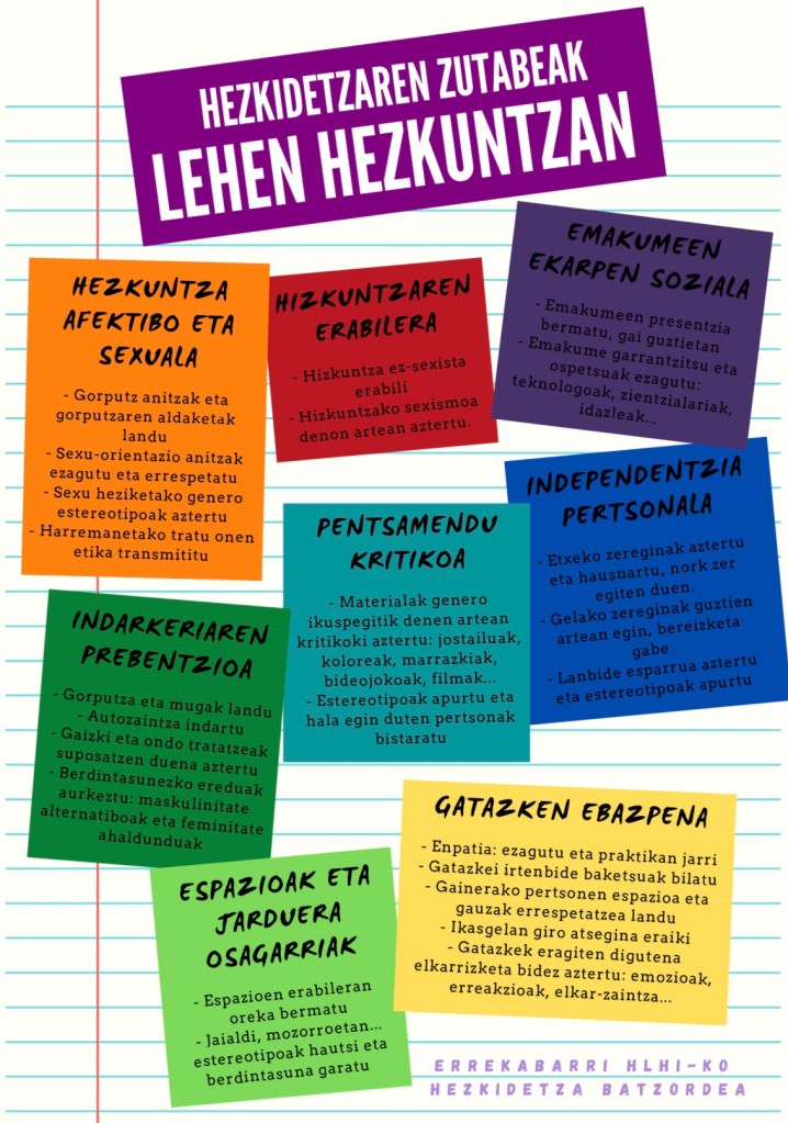 Eusko Jaurlaritzaren Hezkuntza Sailaren II. Hezkidetza planean zehaztutako zutabeak eskolara egokitu ditu bertako Hezkidetza Komisioak, ikusi jarraian: